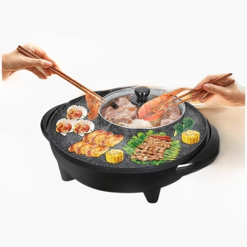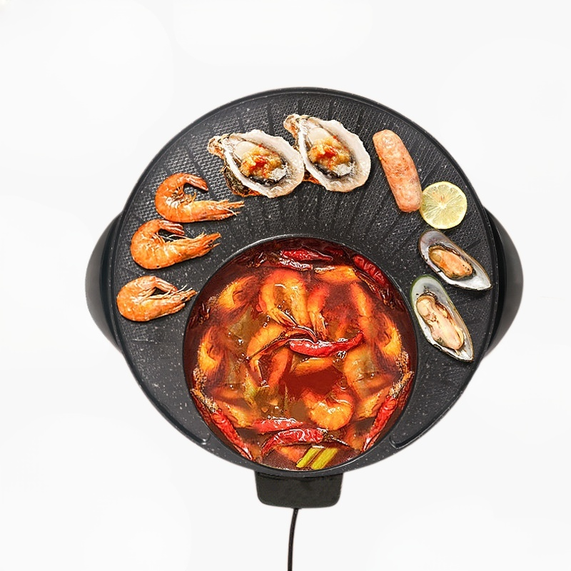 しゃぶしゃぶ一体鍋は仕切り付きで二つの味が同時に楽しめ、掃除も簡単。IH・ガス対応、家族やパーティーに最適。
